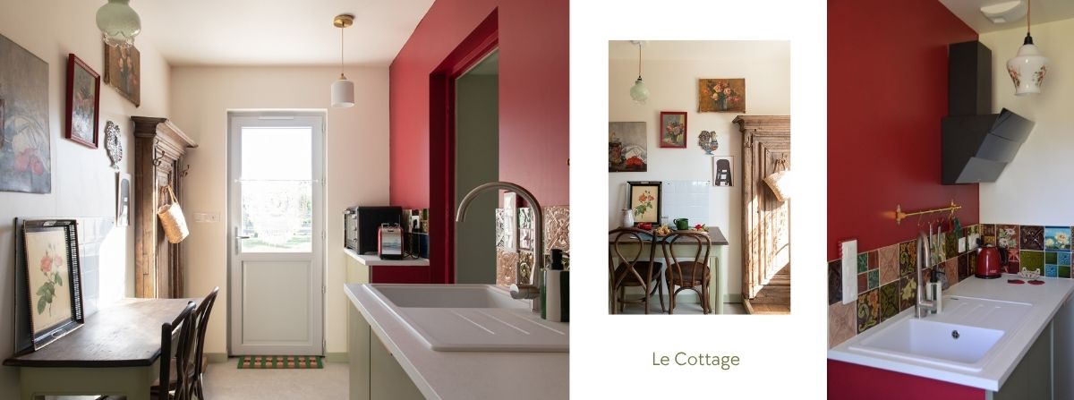 Il se compose d'une petite cuisine tout en longueur (8 m2) donnant sur une terrasse privée avec vue sur le jardin fleuri. La cuisine est équipée d'une plaque amovible, d'un mini four, d'un frigidaire, d'une bouilloire, d'une cafetière Dolce Gusto, d'un grille-pain. Vaisselle chinée et tout le nécessaire pour se faire de petites dinettes.