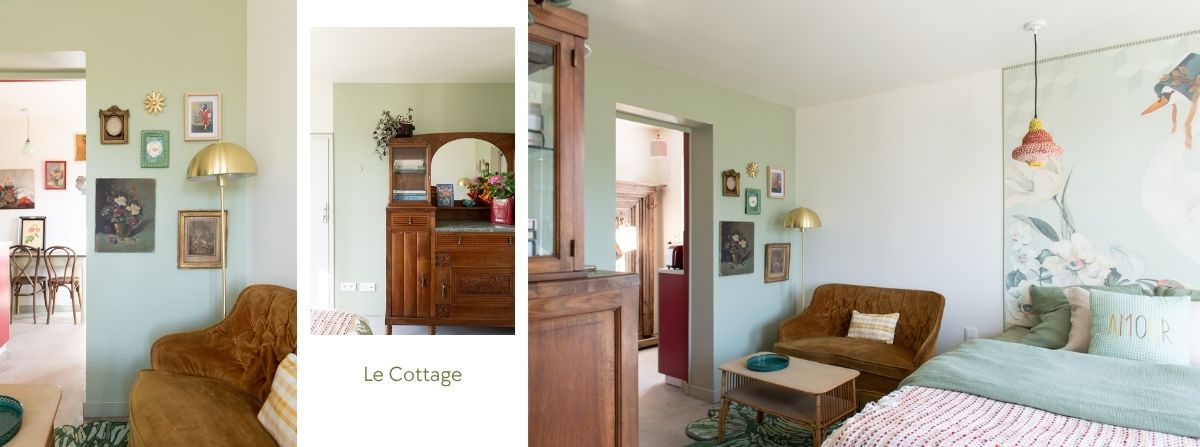 Le Cottage est une maison indépendante de 32m² entièrement rénovée et décorée avec des matériaux de qualité, du mobilier et des éléments de décoration chinés dans un esprit Charleston Farm.