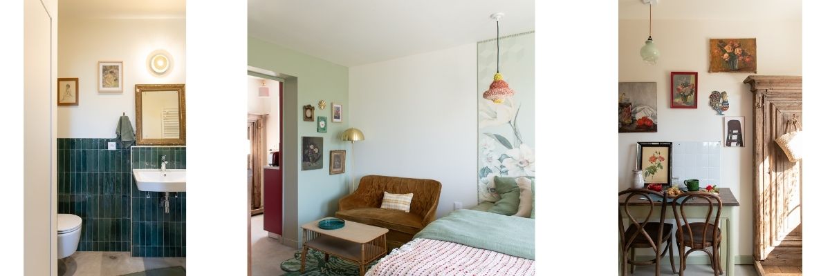 La chambre (16m²) est composée d'un grand lit (160 par 200 cm) et d’un coin salon avec petit canapé vintage, table basse et un meuble Art Déco pour ranger vos affaires. Vous y trouverez également une jolie sélection de livres et des jeux de société.